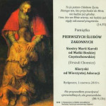 Po roku postulatu i dwuletniej próbie nowicjackiej nadszedł dzień 1 czerwca 2019 r. W tymże dniu, o godz. 11:00 w naszej kaplicy pw. Bożego Ciała odbyła się Msza Święta, podczas której s. Maria Karola złożyła swoje Pierwsze Śluby na okres 3 lat. W uroczystości brała udział nasza wspólnota, zaproszeni kapłani, rodzina siostry oraz koleżanki ze studiów, które piękną oprawą muzyczną dopomogły zgromadzonemu Ludowi Bożemu wznosić swe modlitwy do Boga.