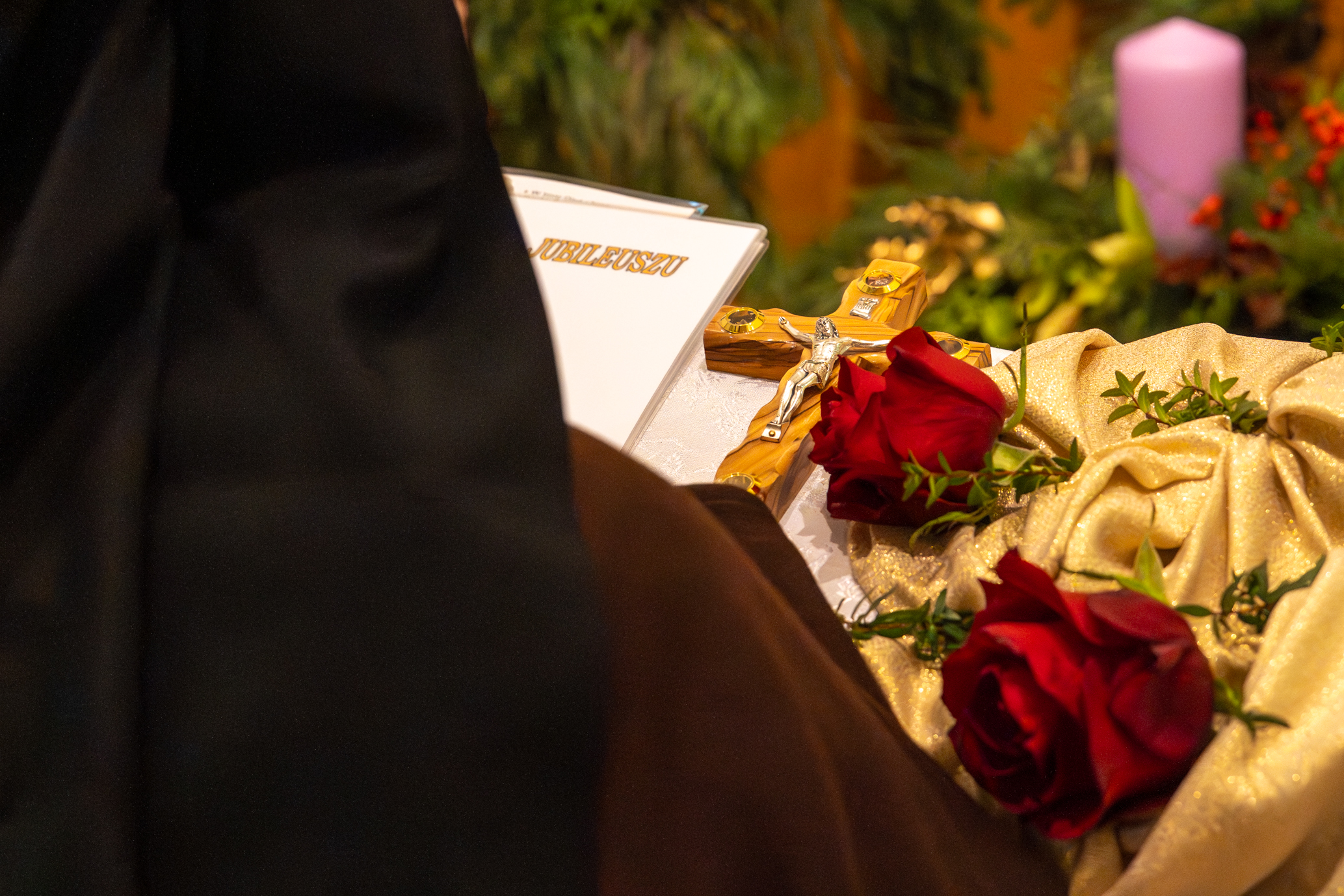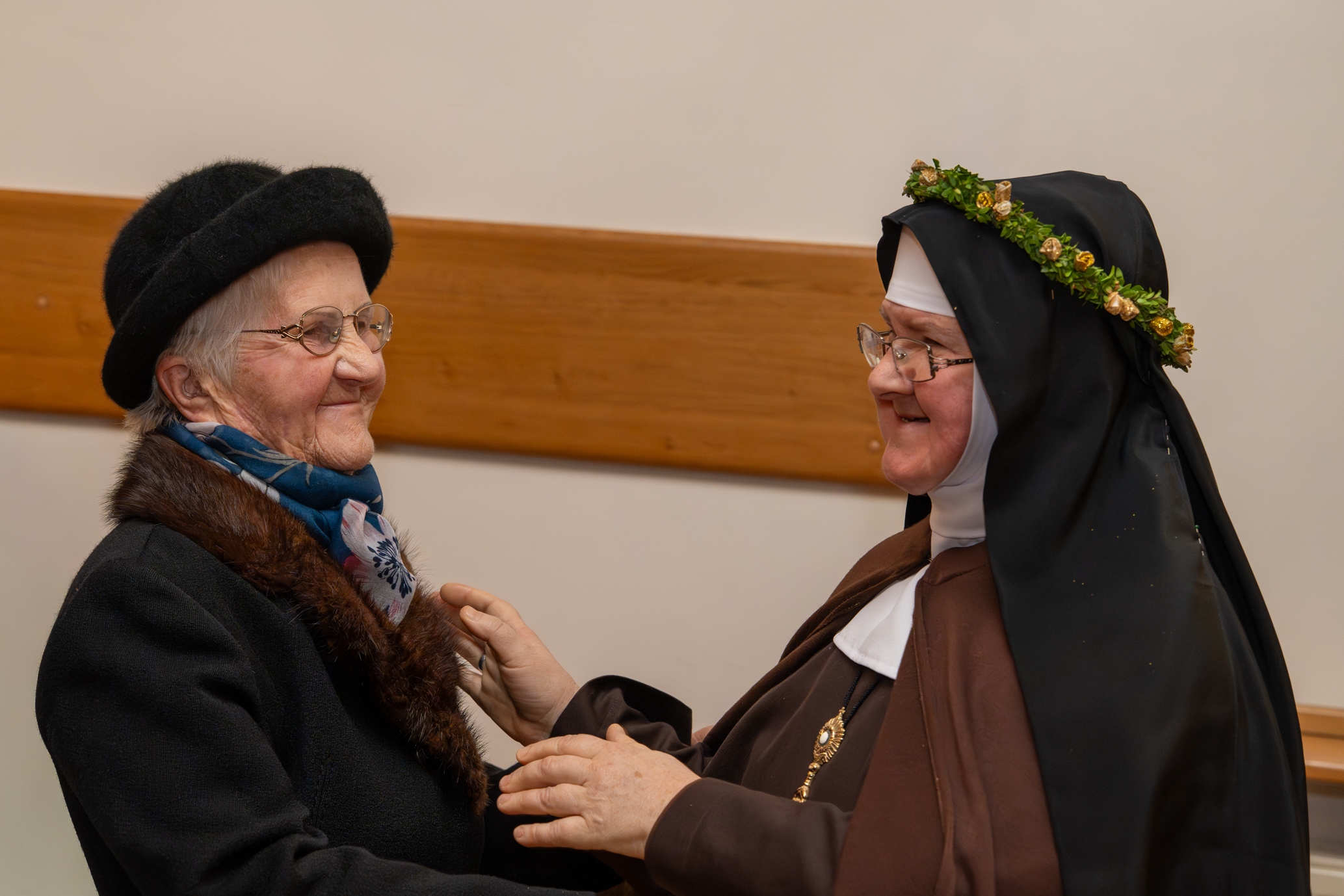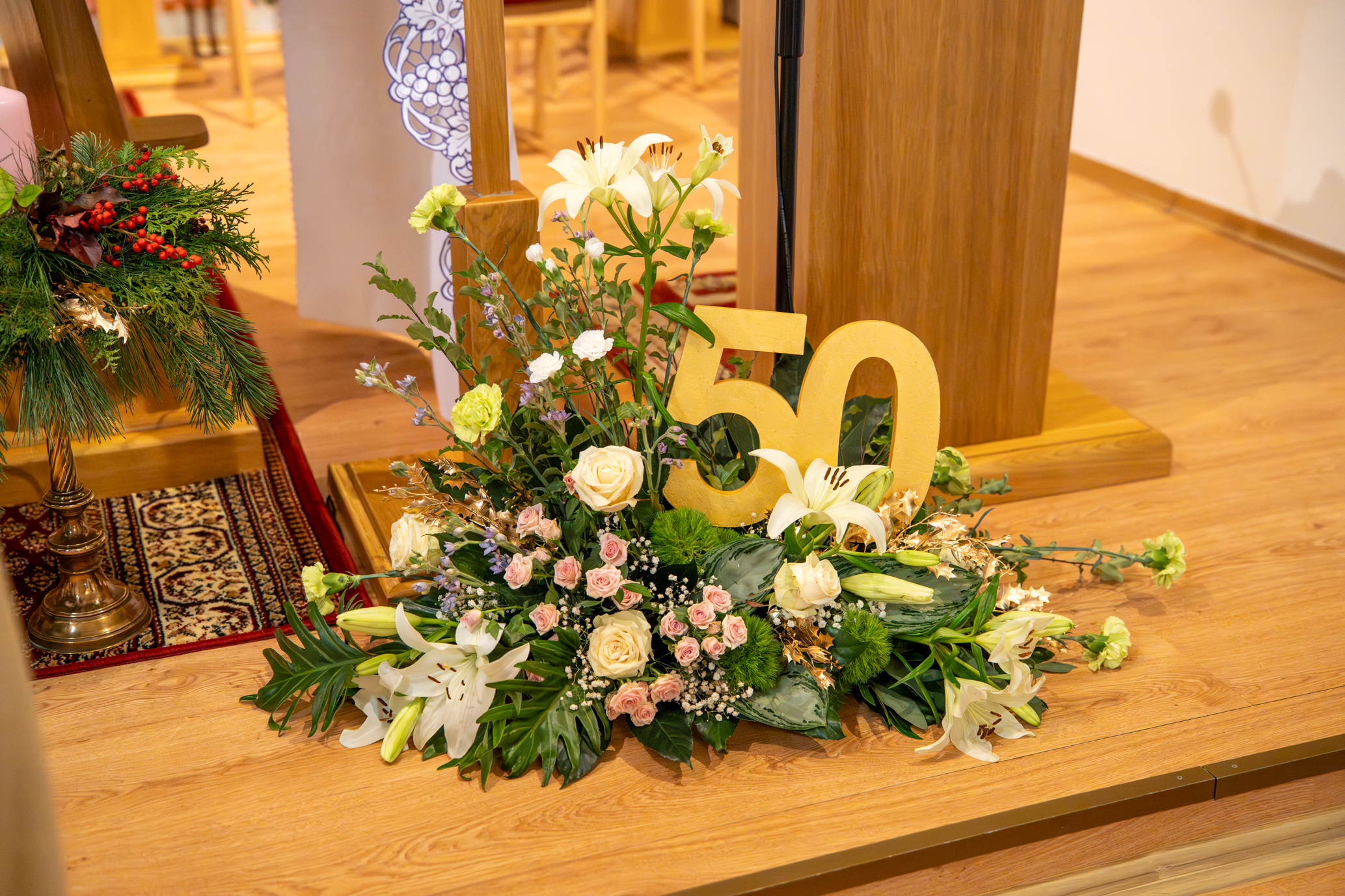 Idziemy od jednego Jubileuszu do drugiego. 3 miesiące temu obchodziłyśmy 100-lecie; tym razem pod wielką „setką” zawieszoną w kaplicy pojawiły się bukiety kwiatów z ozdobną „pięćdziesiątką” – jako że 8 grudnia 2025 r. nasza s. M. Beata od Narodzenia Pańskiego (Teresa Mendyk) obchodziła 50-lecie Profesji Świętej.