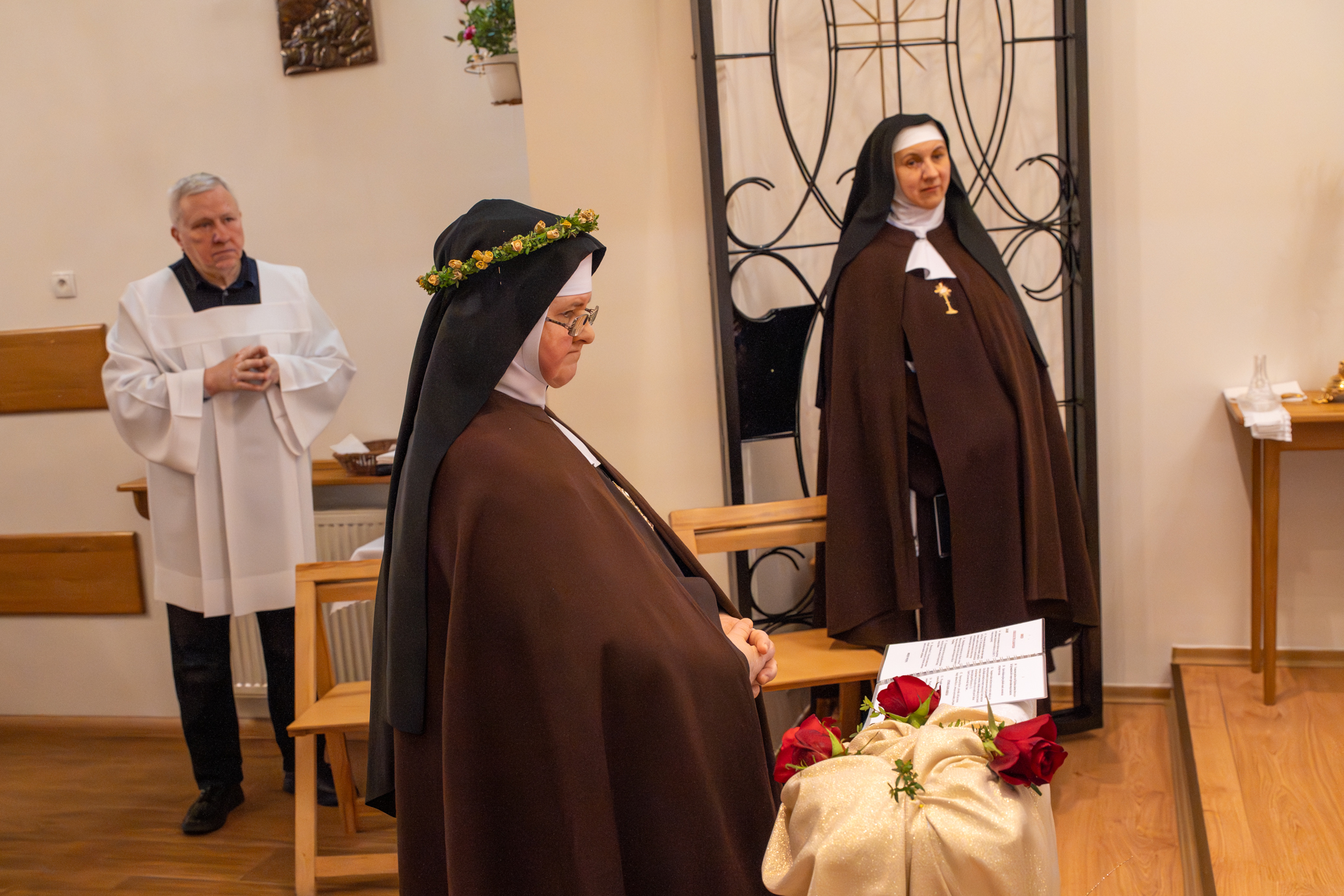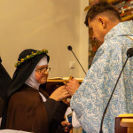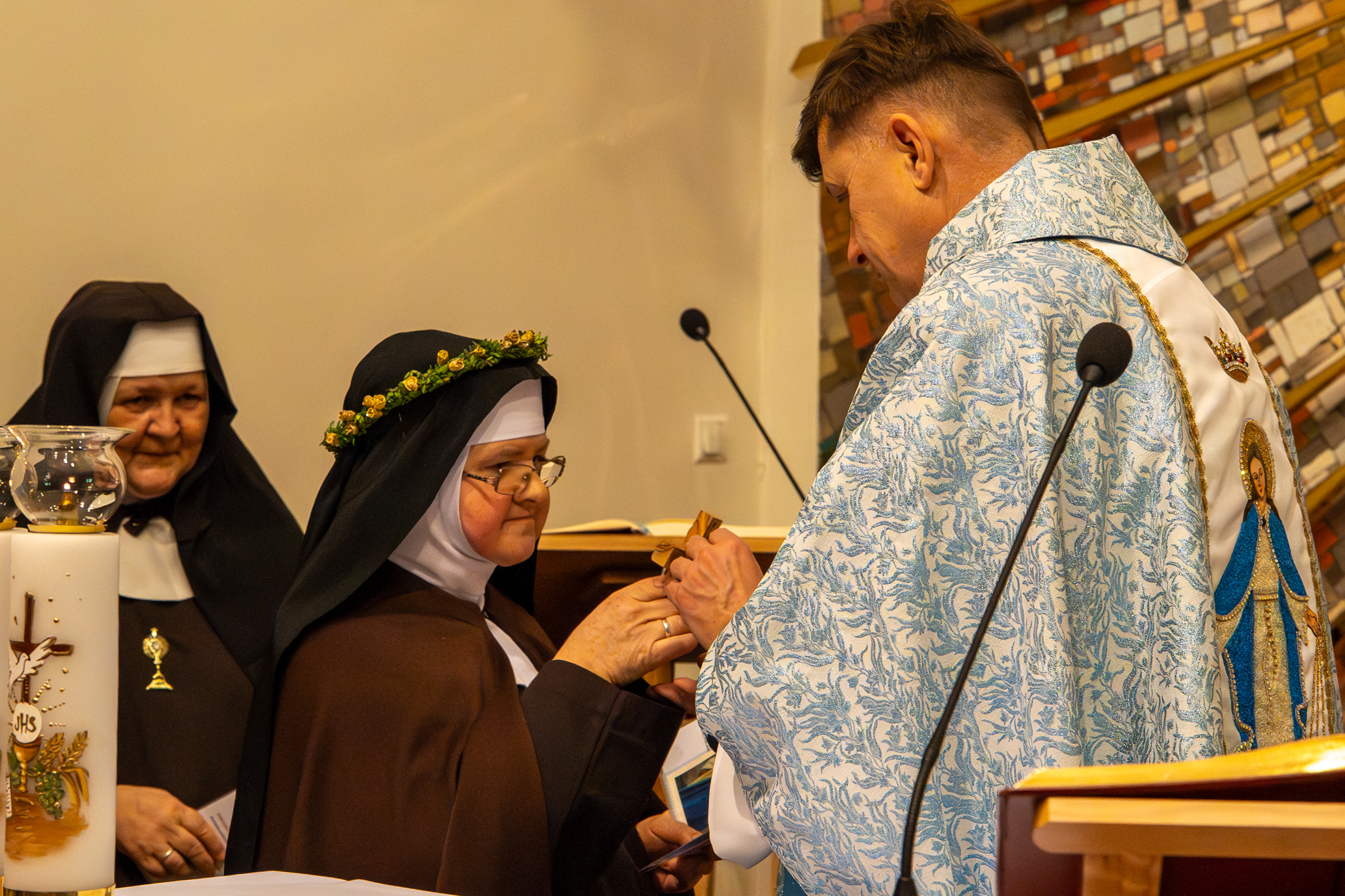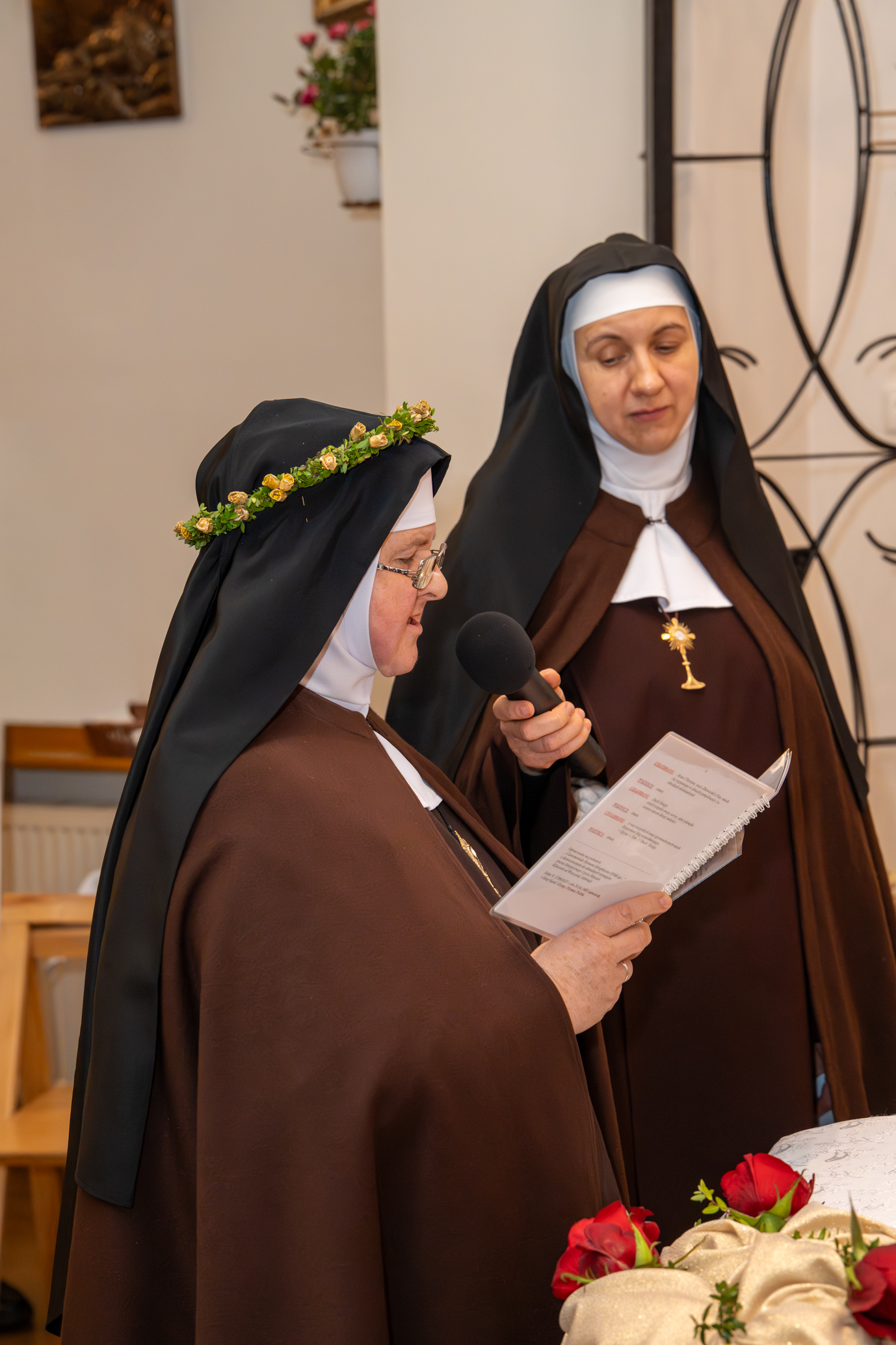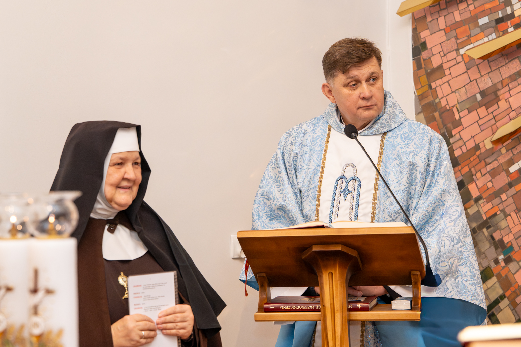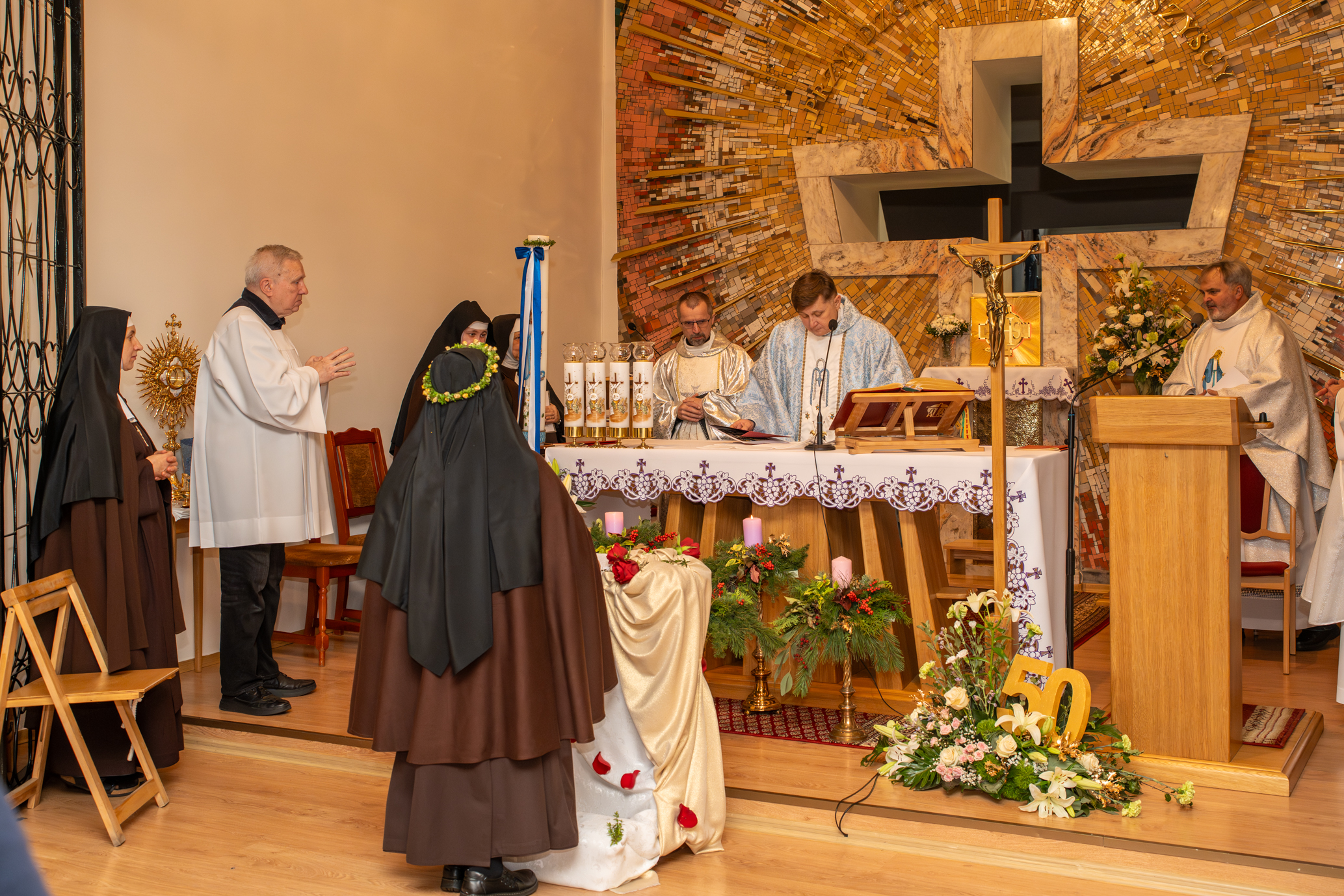 Msza Święta jubileuszowa rozpoczęła się o godz. 11:00. Brała w niej udział, oczywiście, Siostra Jubilatka wraz z naszą wspólnotą oraz najbliższą swoją rodziną, której niektórzy członkowie – mieszkający w różnych częściach Polski – przyjechali już dzień wcześniej, aby móc towarzyszyć Siostrze w tym wyjątkowym dla niej dniu. Co jednak najważniejsze – i jest to ewenement w historii naszej wspólnoty – mama s. Beaty dożyła Złotego Jubileuszu swojej córki i również była obecna na uroczystości. Było to możliwe, jako że s. Beata wstąpiła do Zakonu, mając 15 lat i będąc najstarszą córką w swojej rodzinie.