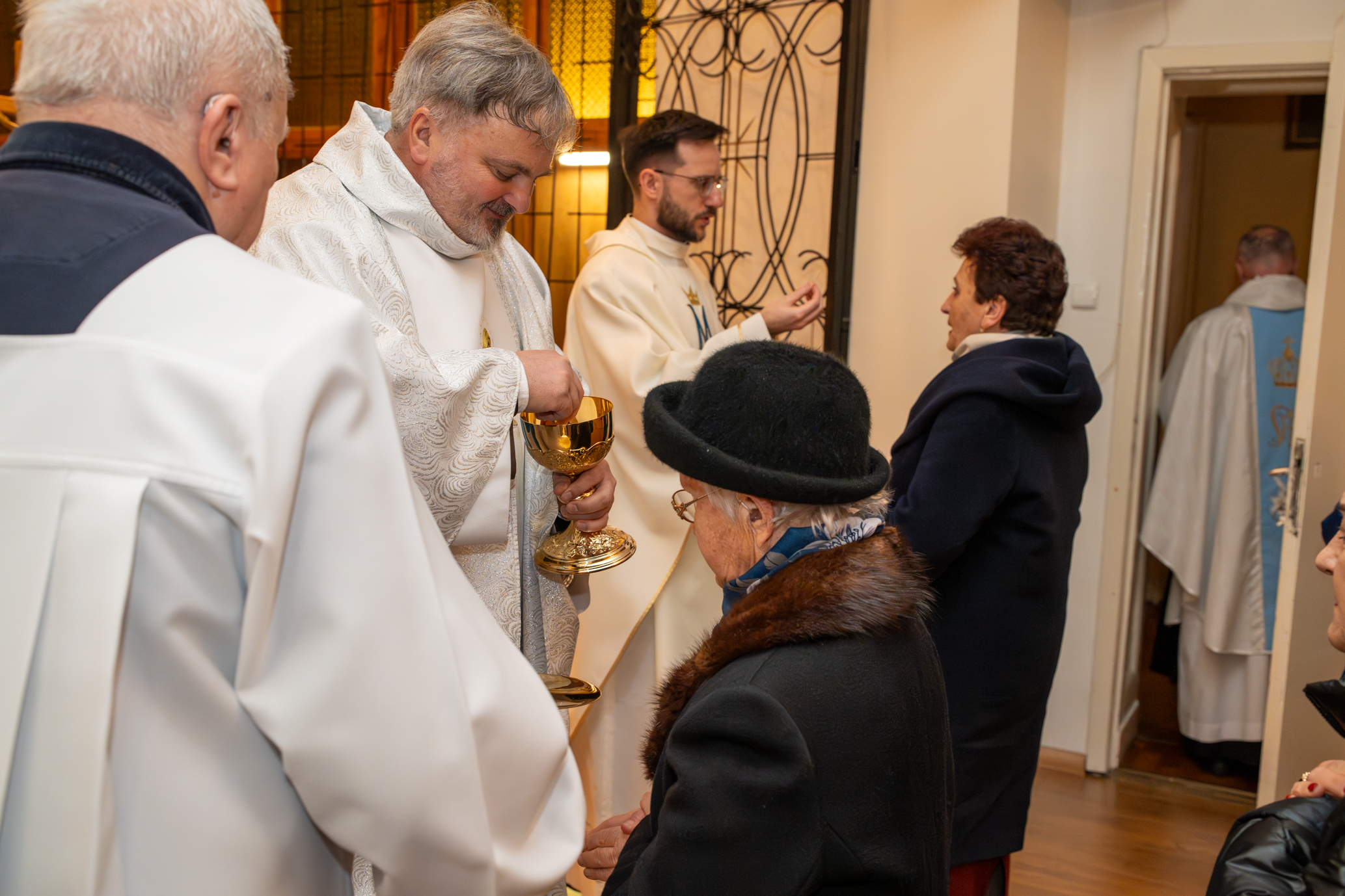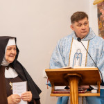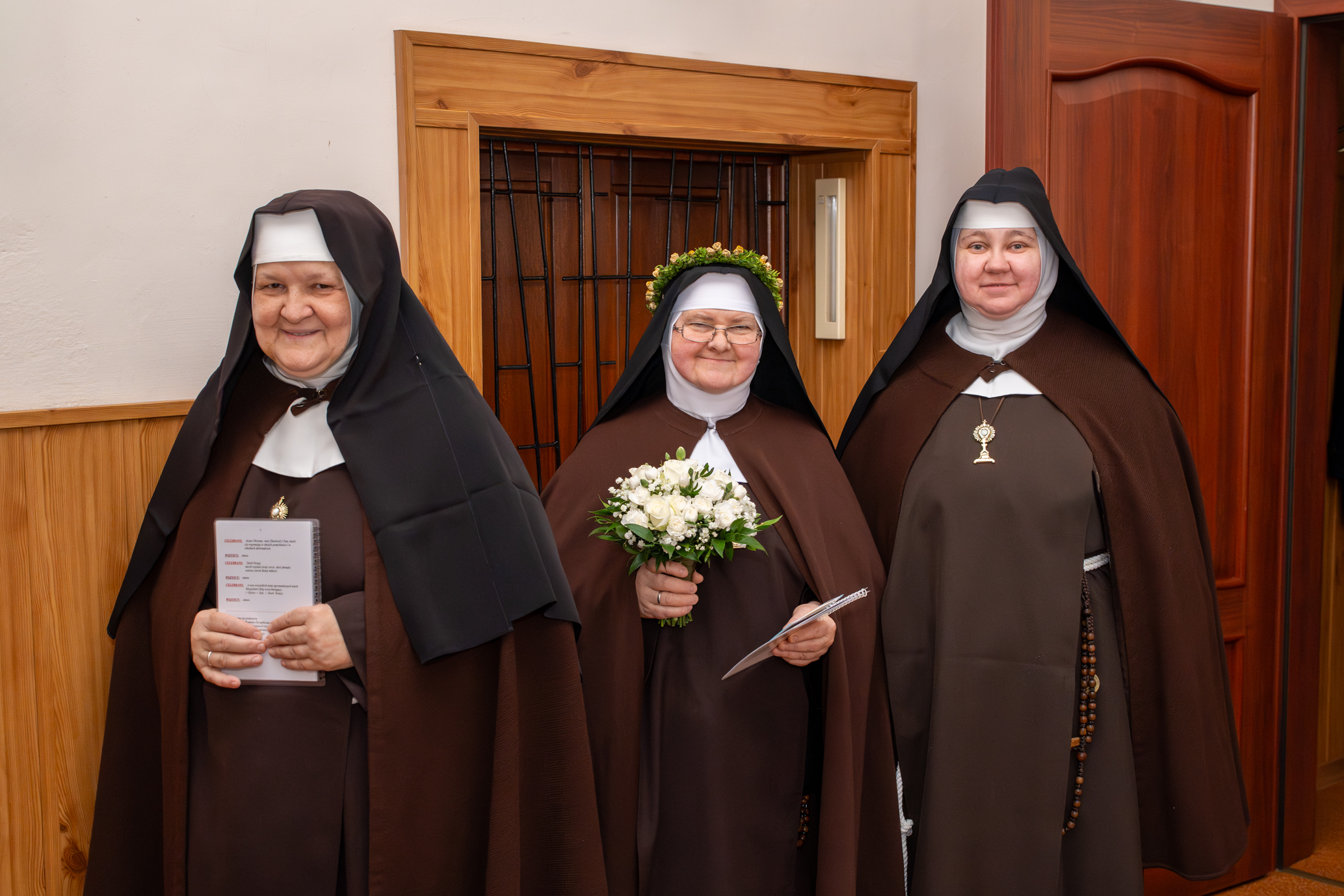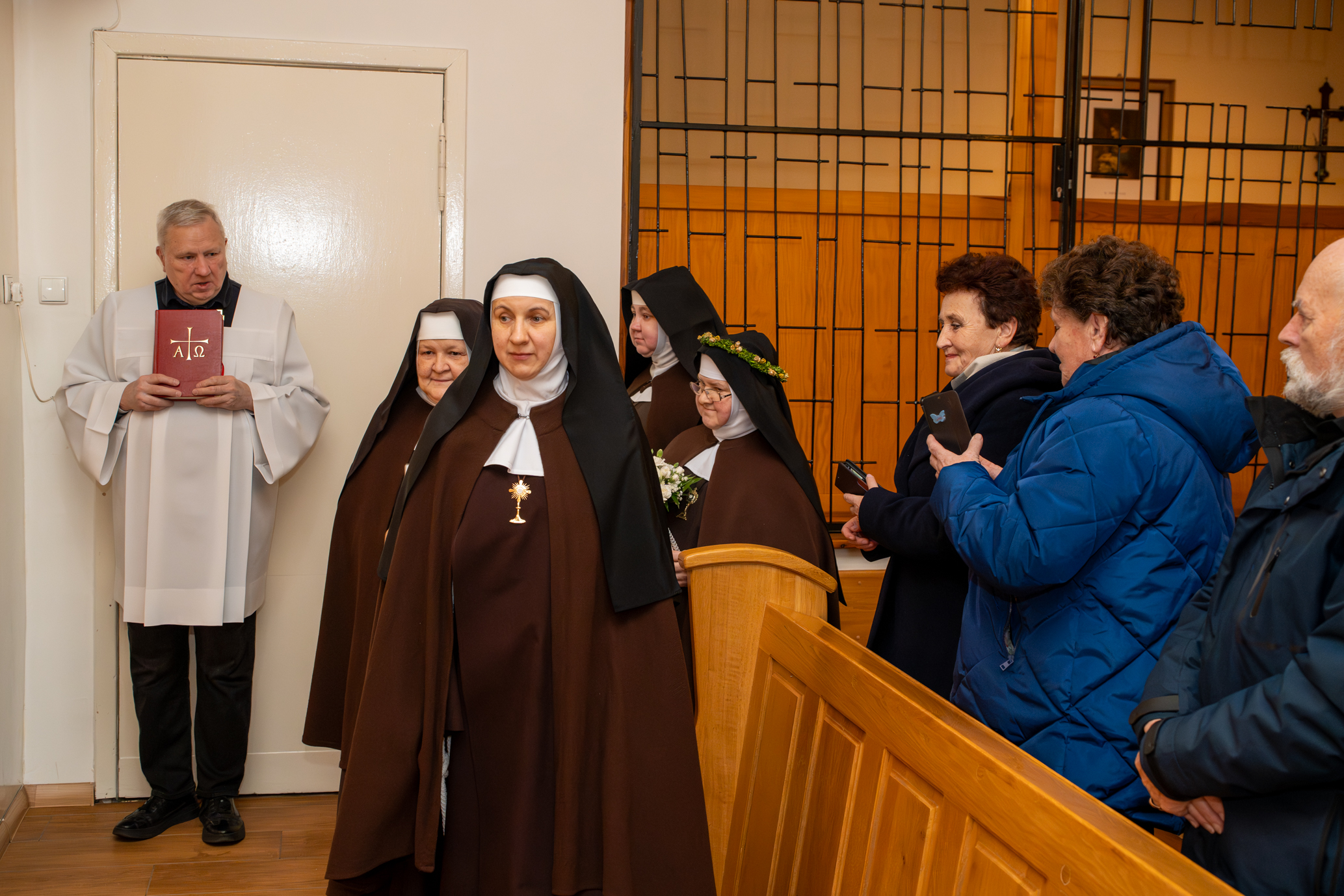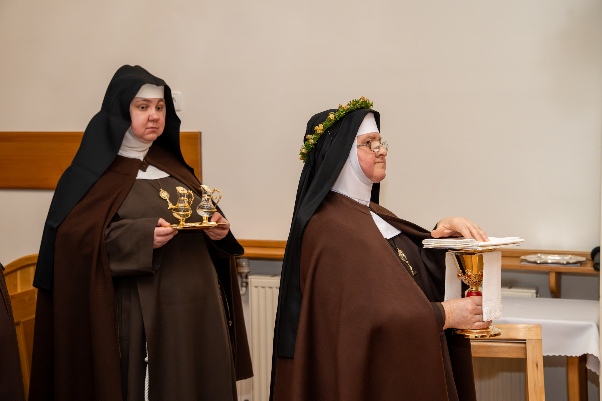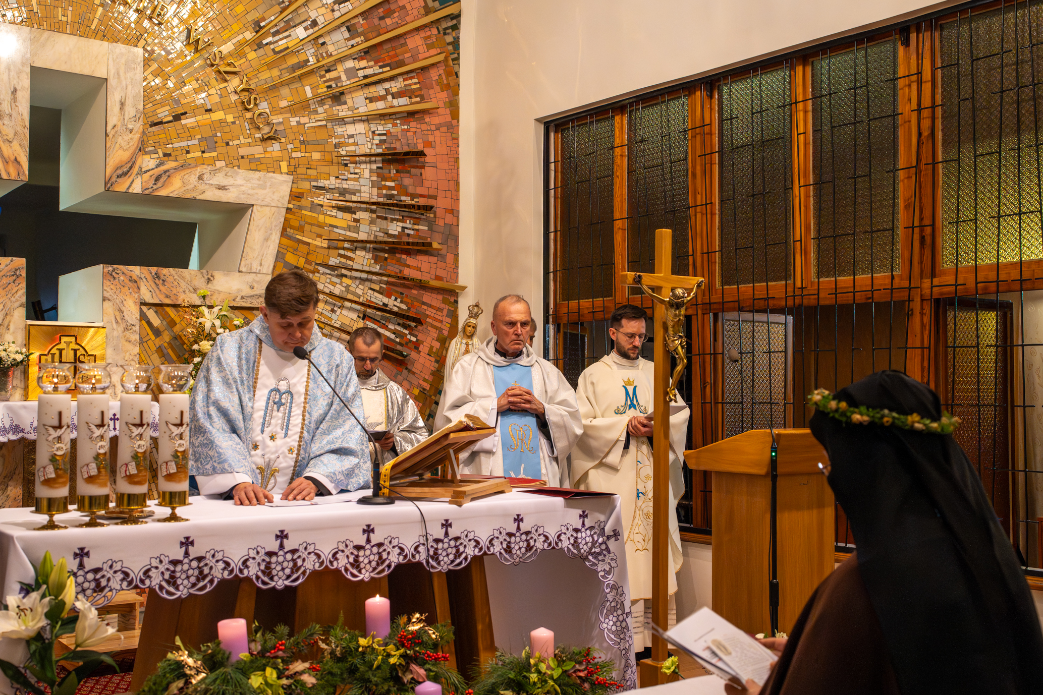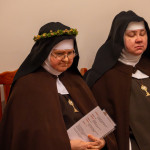 Msza Święta jubileuszowa rozpoczęła się o godz. 11:00. Brała w niej udział, oczywiście, Siostra Jubilatka wraz z naszą wspólnotą oraz najbliższą swoją rodziną, której niektórzy członkowie – mieszkający w różnych częściach Polski – przyjechali już dzień wcześniej, aby móc towarzyszyć Siostrze w tym wyjątkowym dla niej dniu. Co jednak najważniejsze – i jest to ewenement w historii naszej wspólnoty – mama s. Beaty dożyła Złotego Jubileuszu swojej córki i również była obecna na uroczystości. Było to możliwe, jako że s. Beata wstąpiła do Zakonu, mając 15 lat i będąc najstarszą córką w swojej rodzinie.
